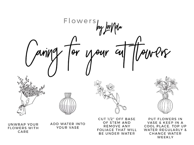 • Delivery fees are calculated at checkout based on your distance from Flowers by LeeNela – see more info loaded on our check out page.